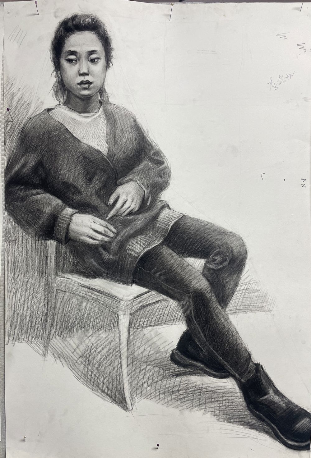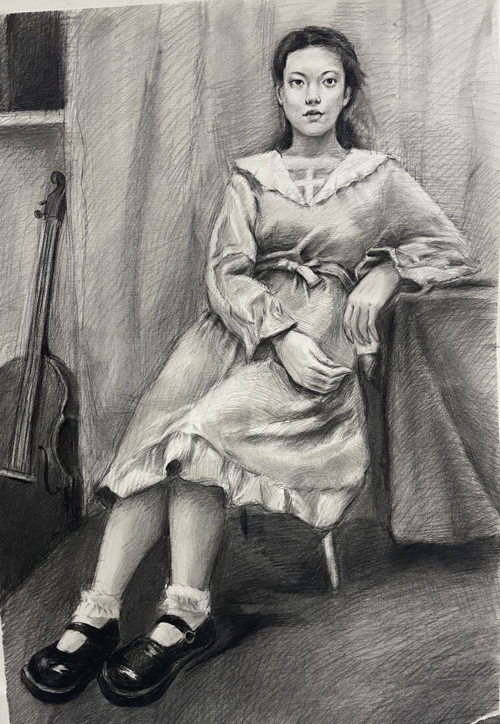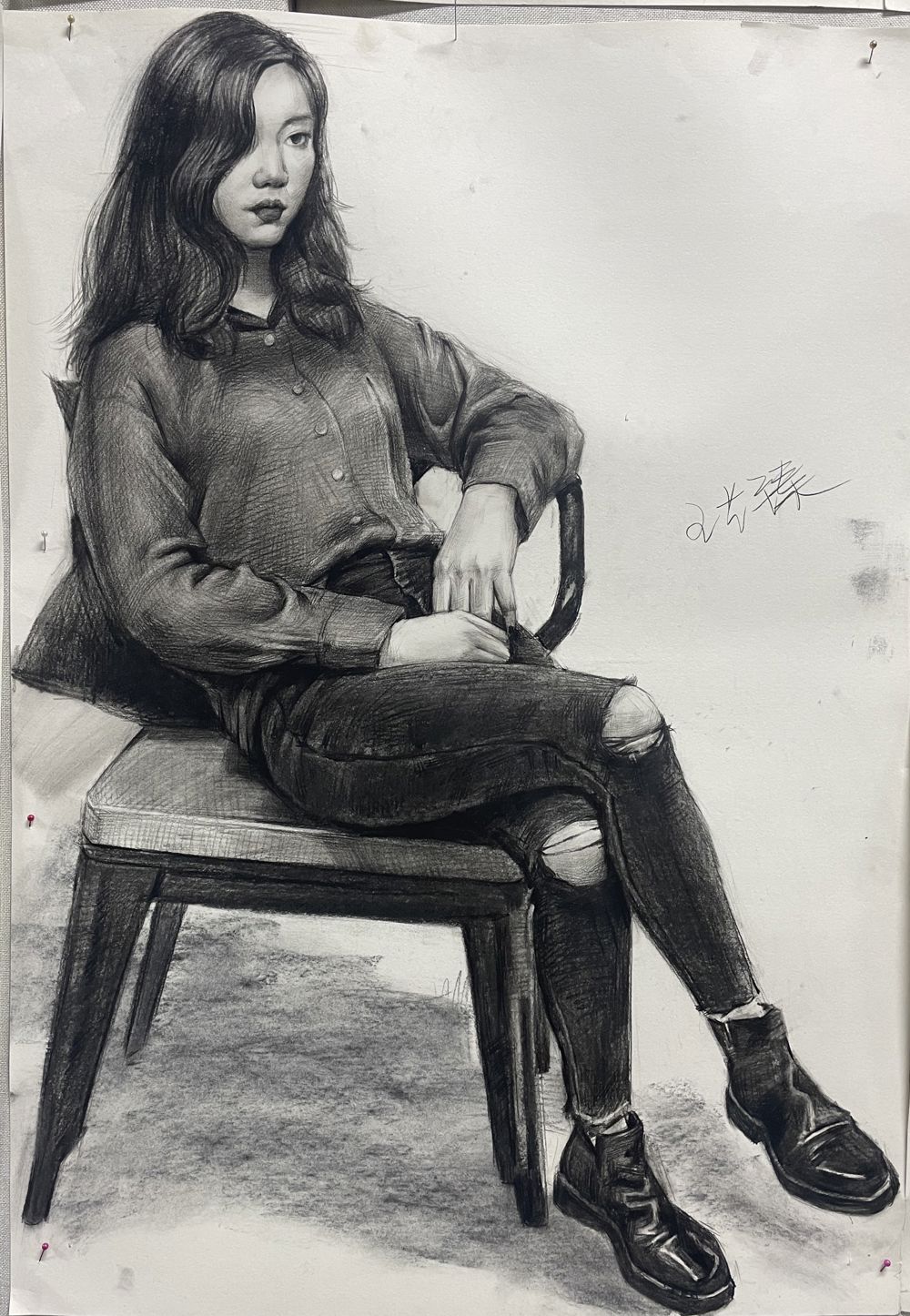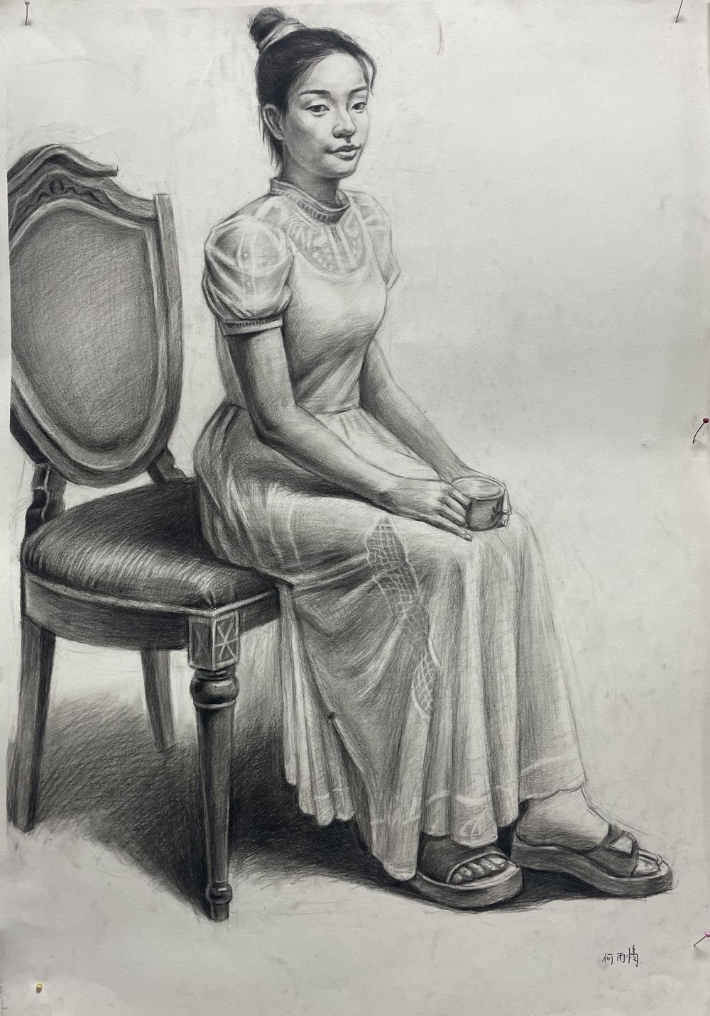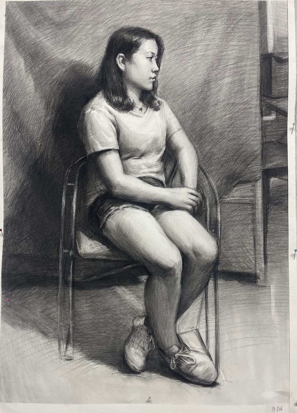 背景幕布、椅子与人物臀部的黑白灰关系处理的不错,手臂与腿也把模特的体型特点表现的很到位