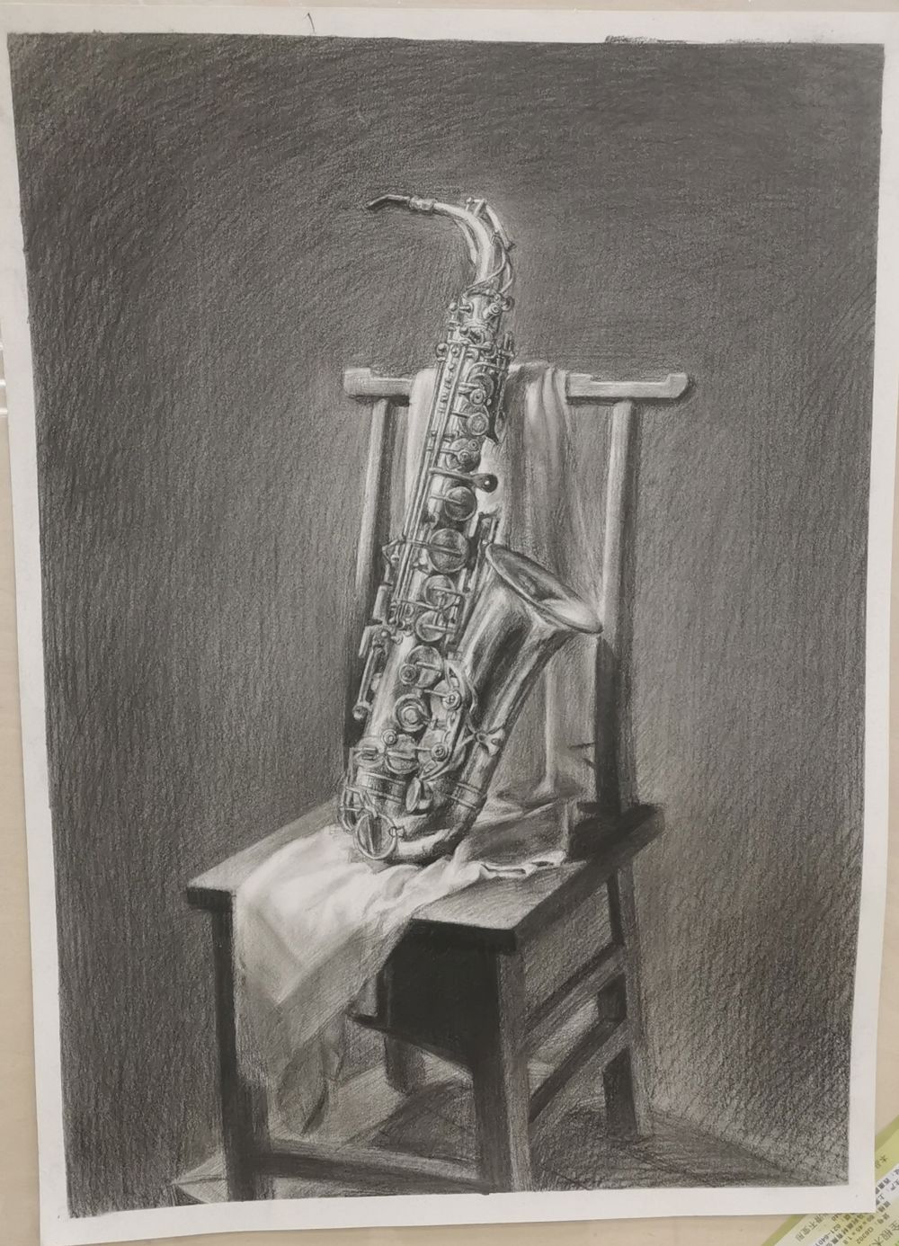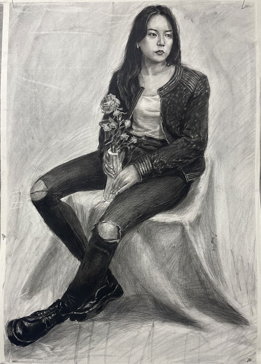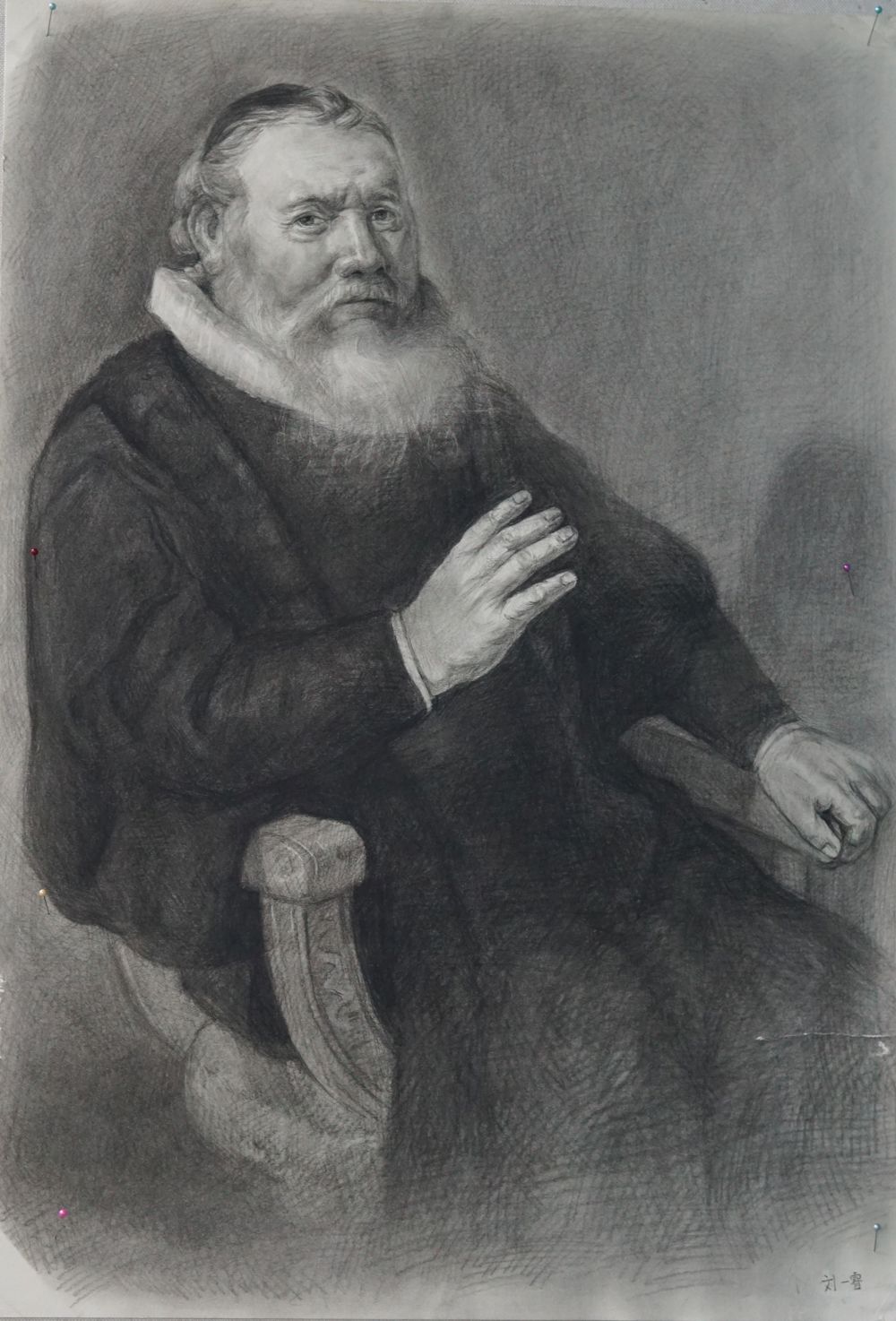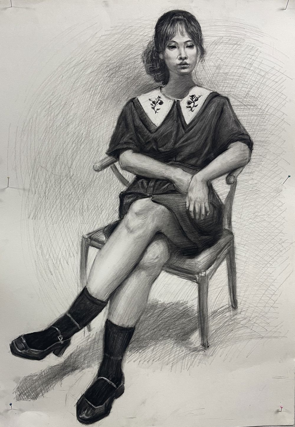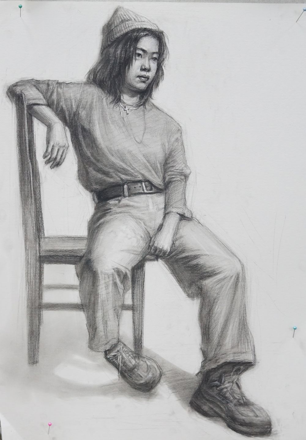 背景幕布、椅子与人物臀部的黑白灰关系处理的不错,手臂与腿也把模特的体型特点表现的很到位
