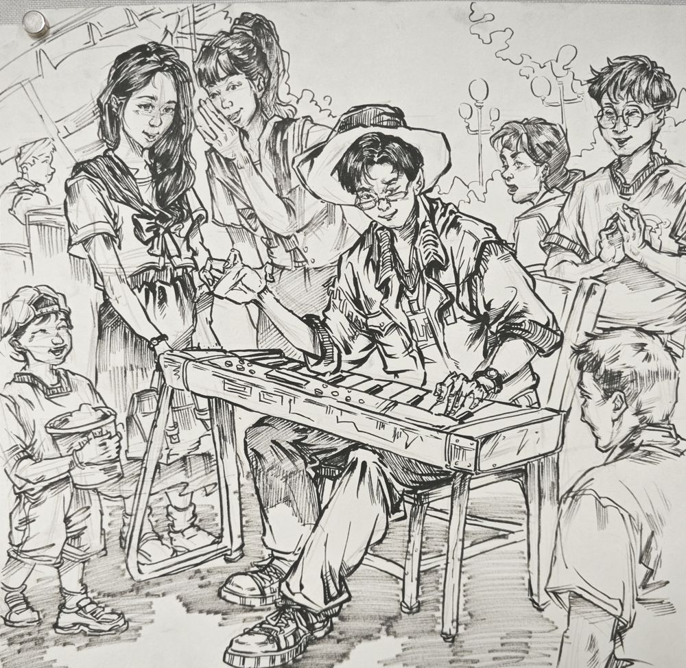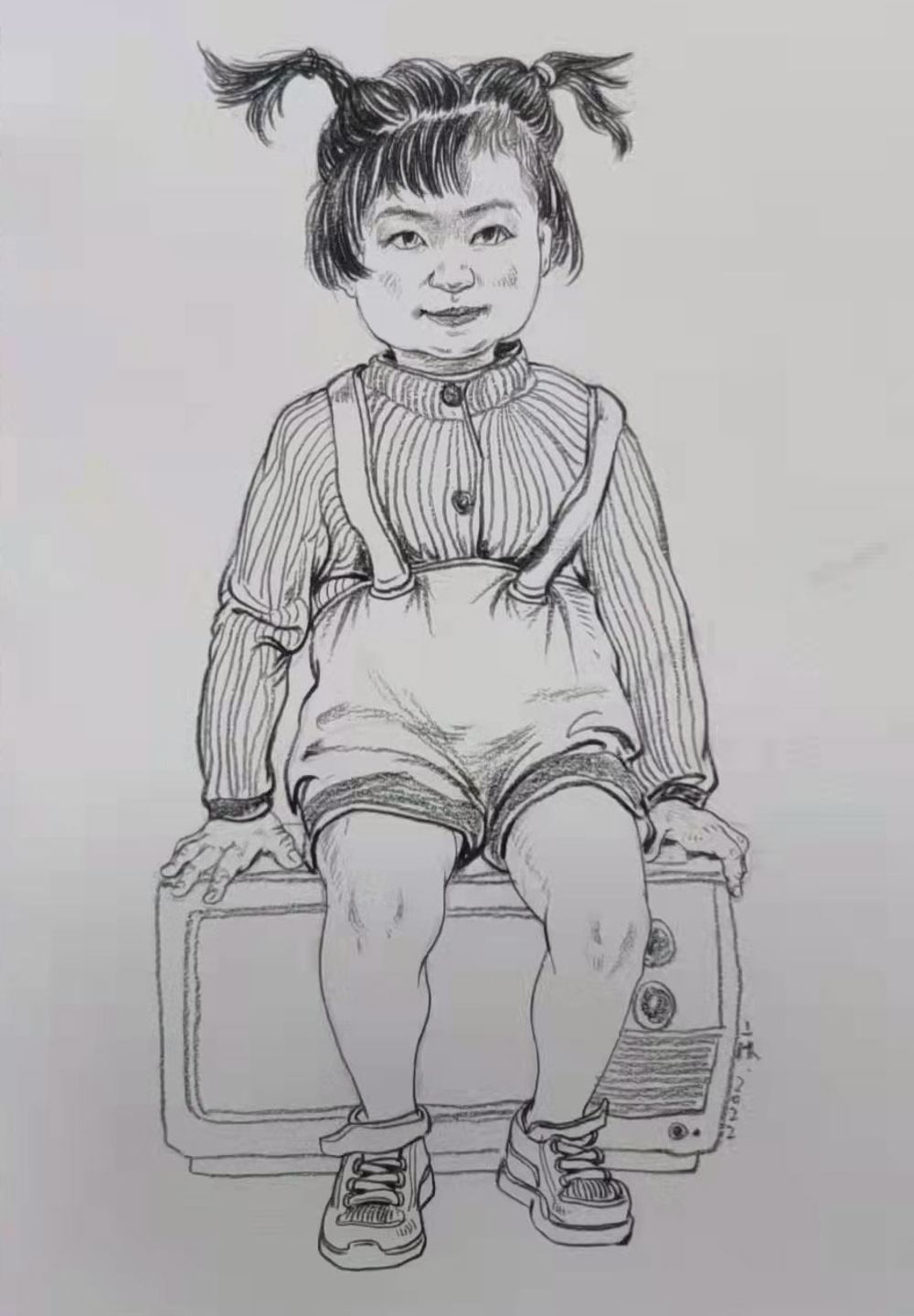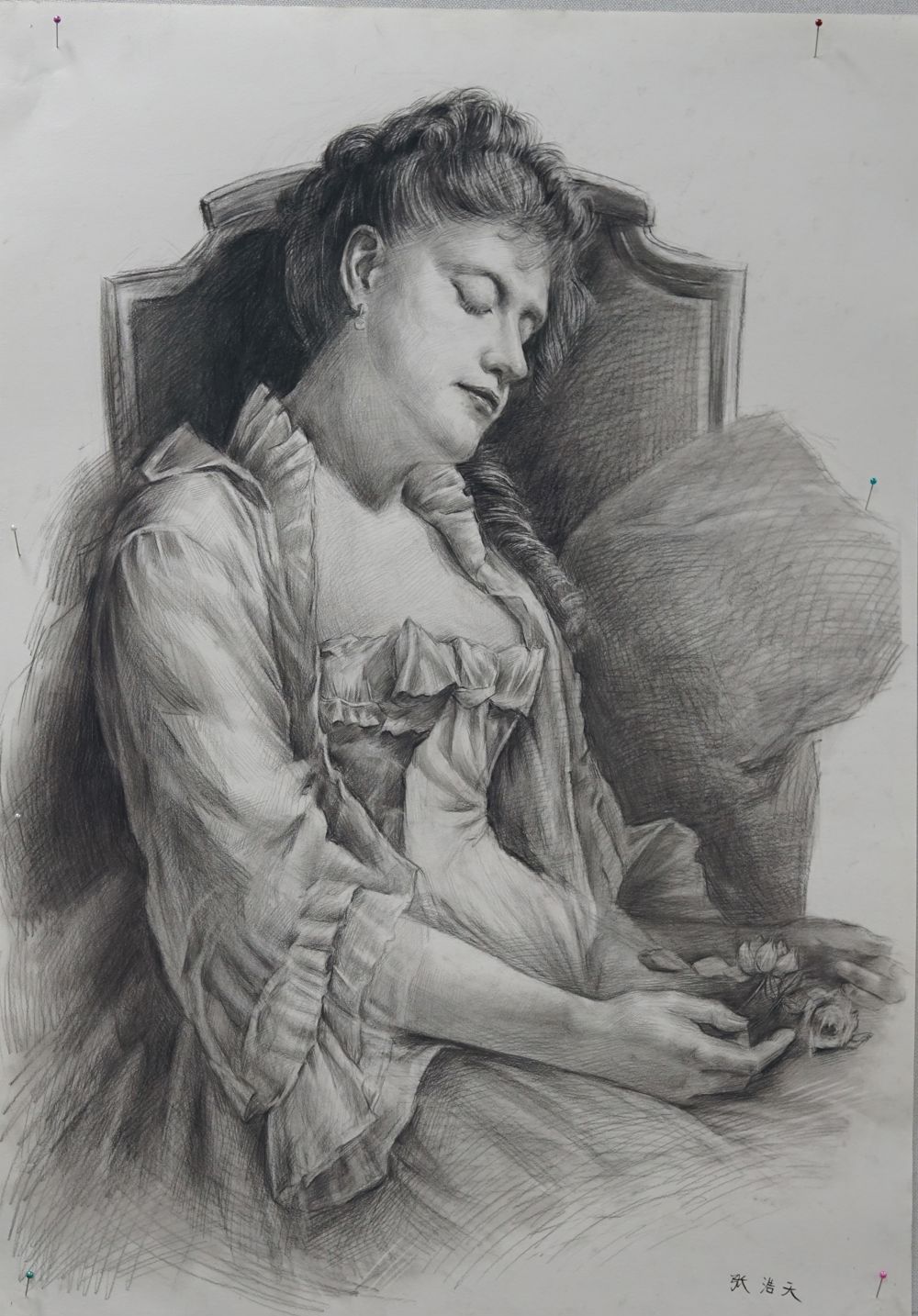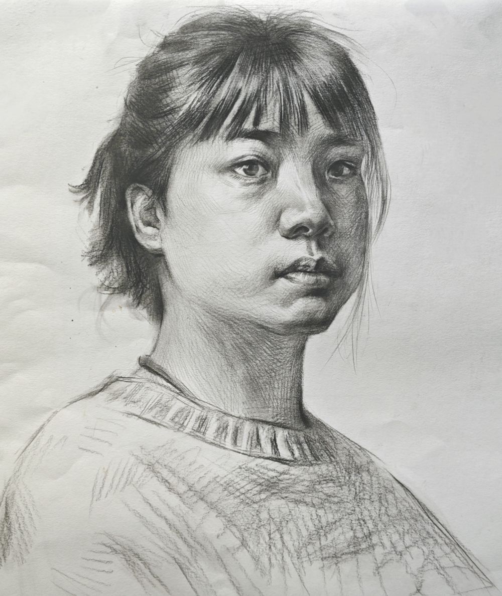人物比列协调,侧脸、上衣与手臂的细节刻画很好