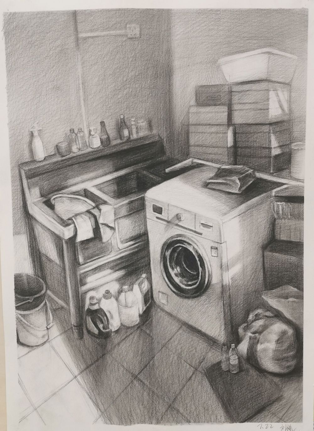 静物素描掌握方法其实画起来是很容易的,这幅作品把静物质感、空间、固有色都发挥的很出色
