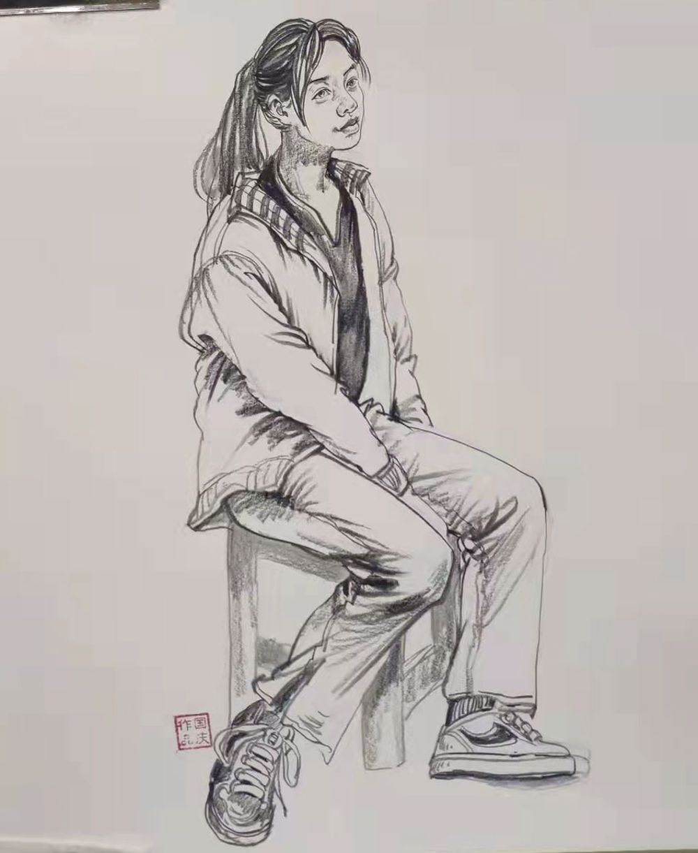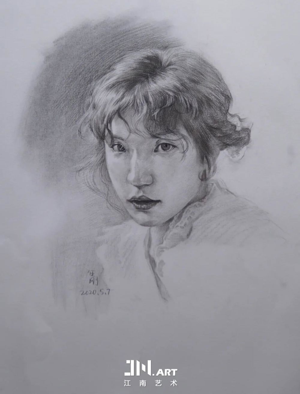 素描女青年形象生动氛围感满满有邻家女孩的亲切。画者大胆的使用大面积背景来衬托女孩皮肤衣服白皙的质感,也是自信得体现