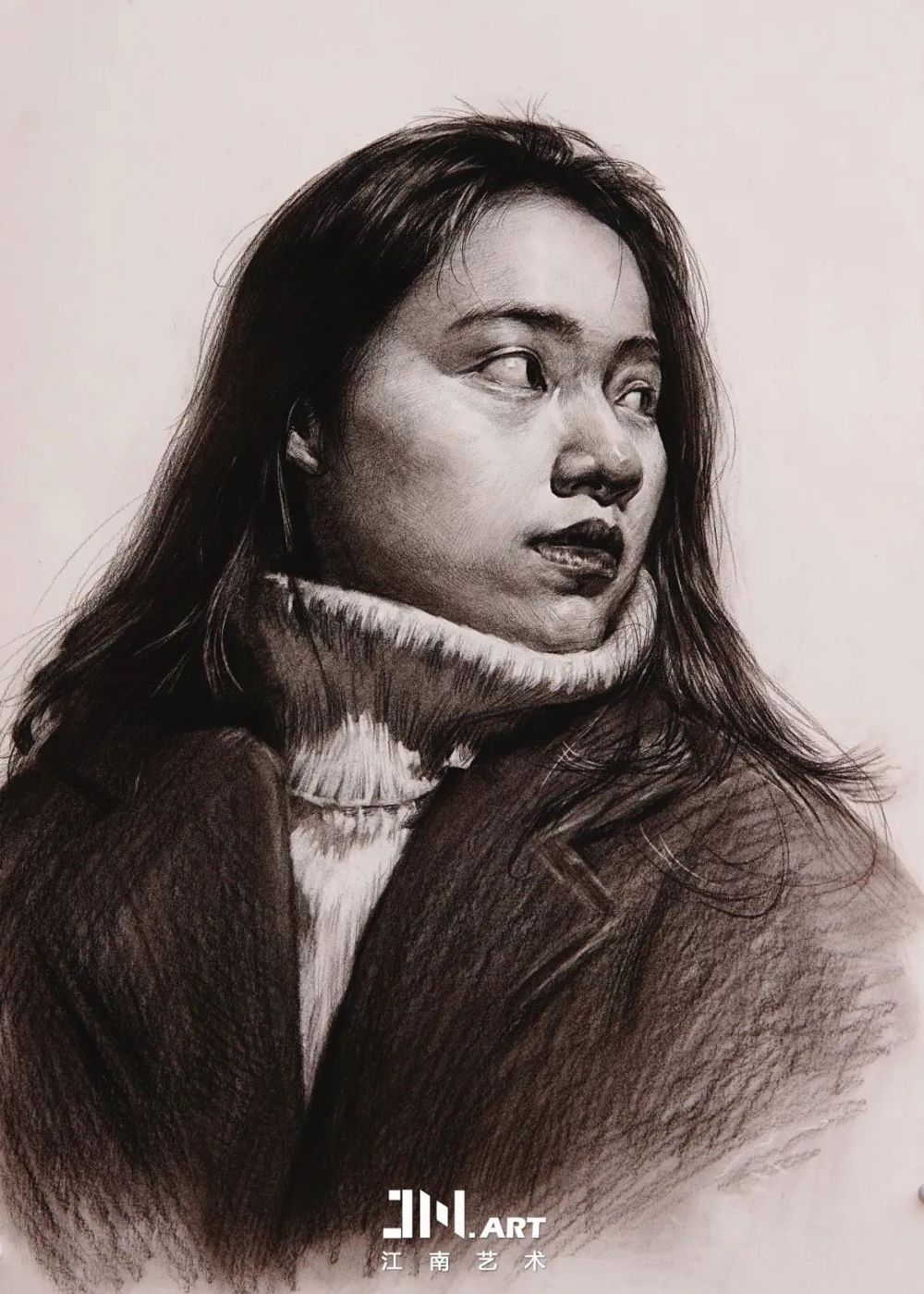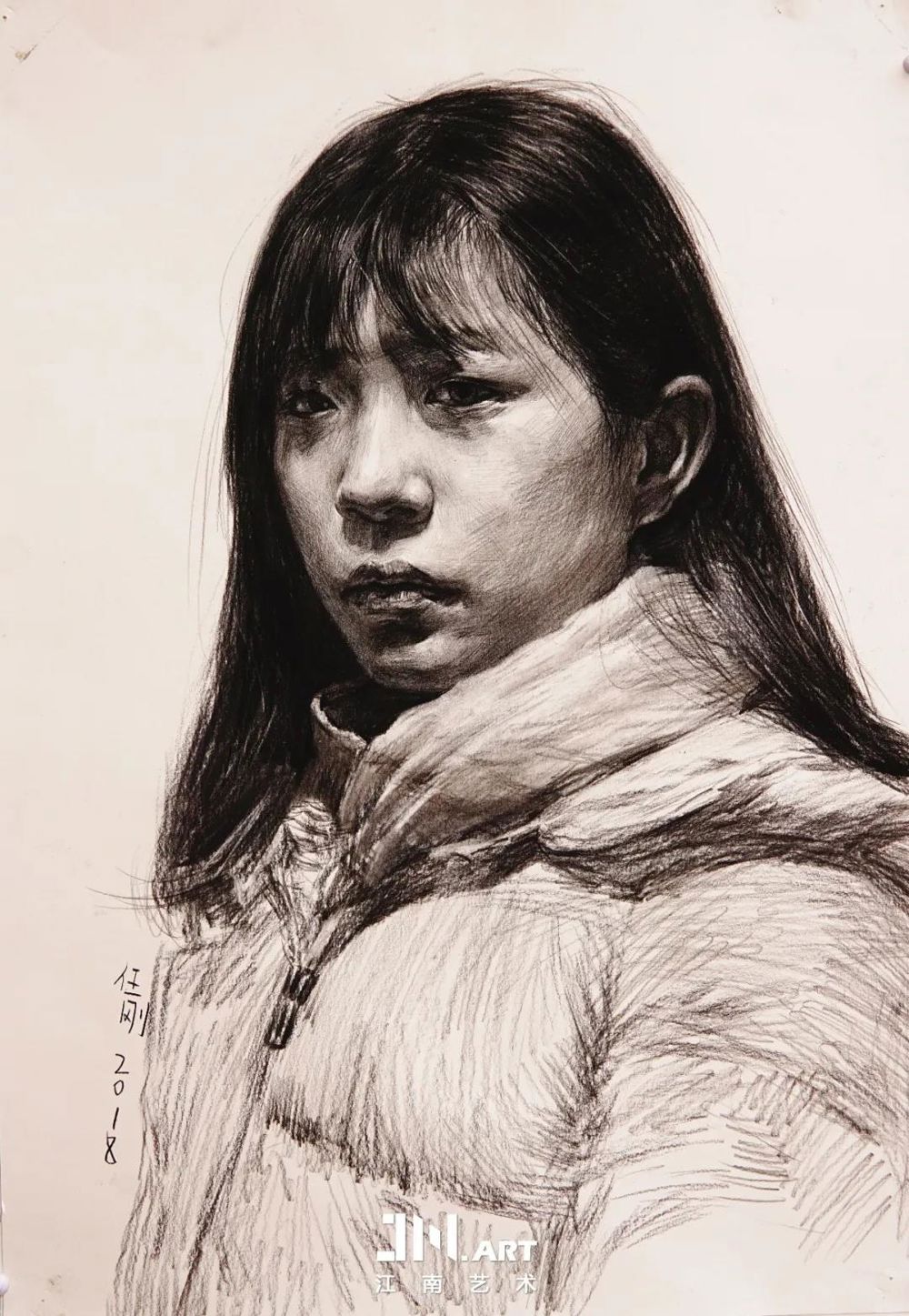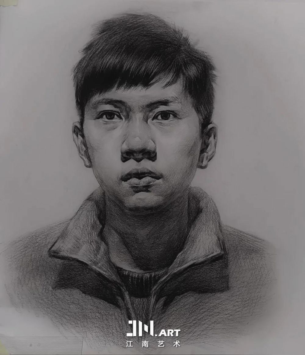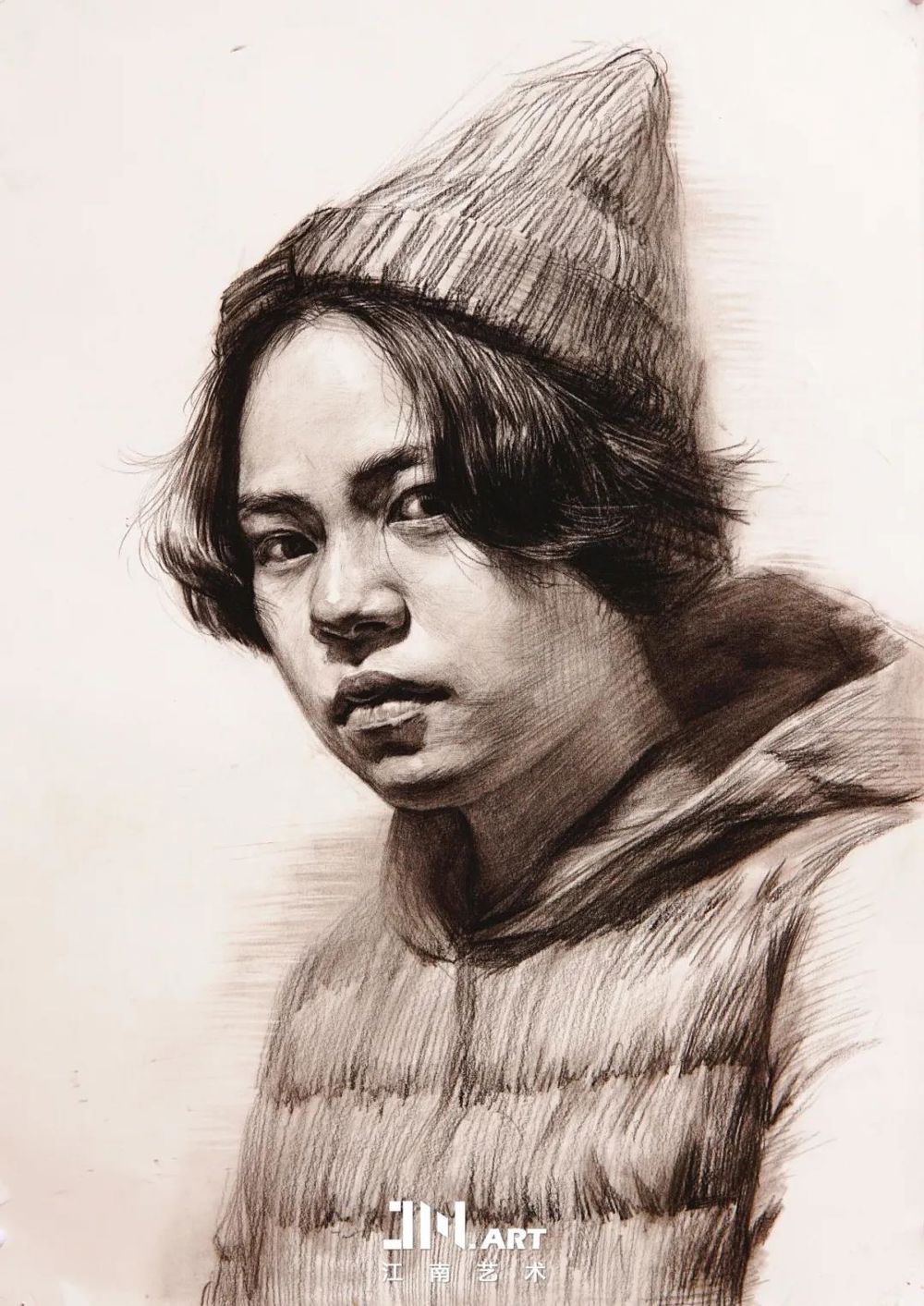 素描半身像,笔触与擦揉的技术法把羽绒服的细节表现的很好