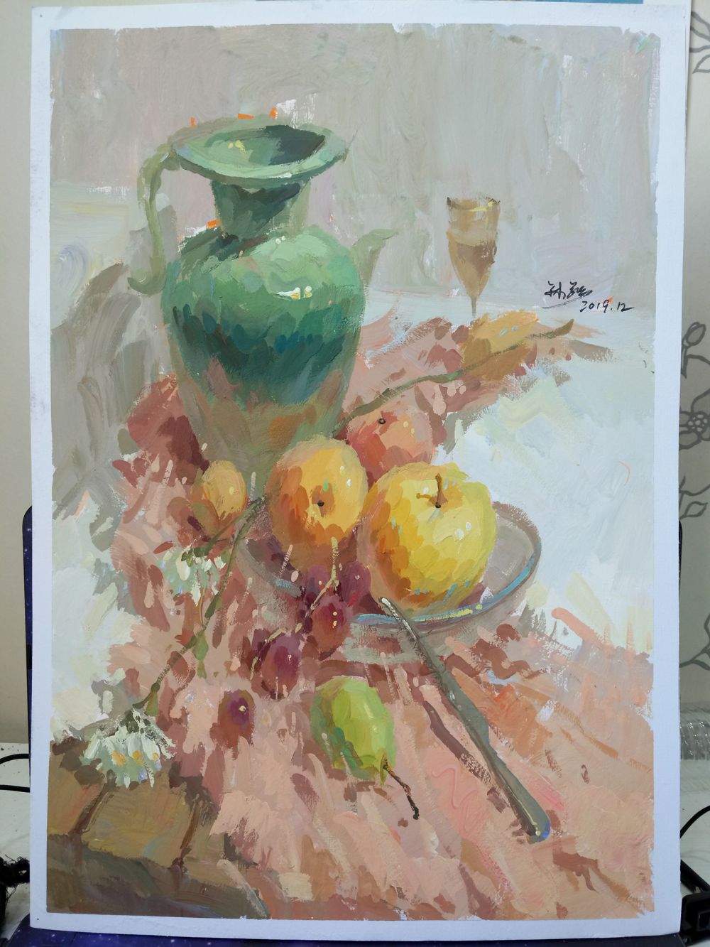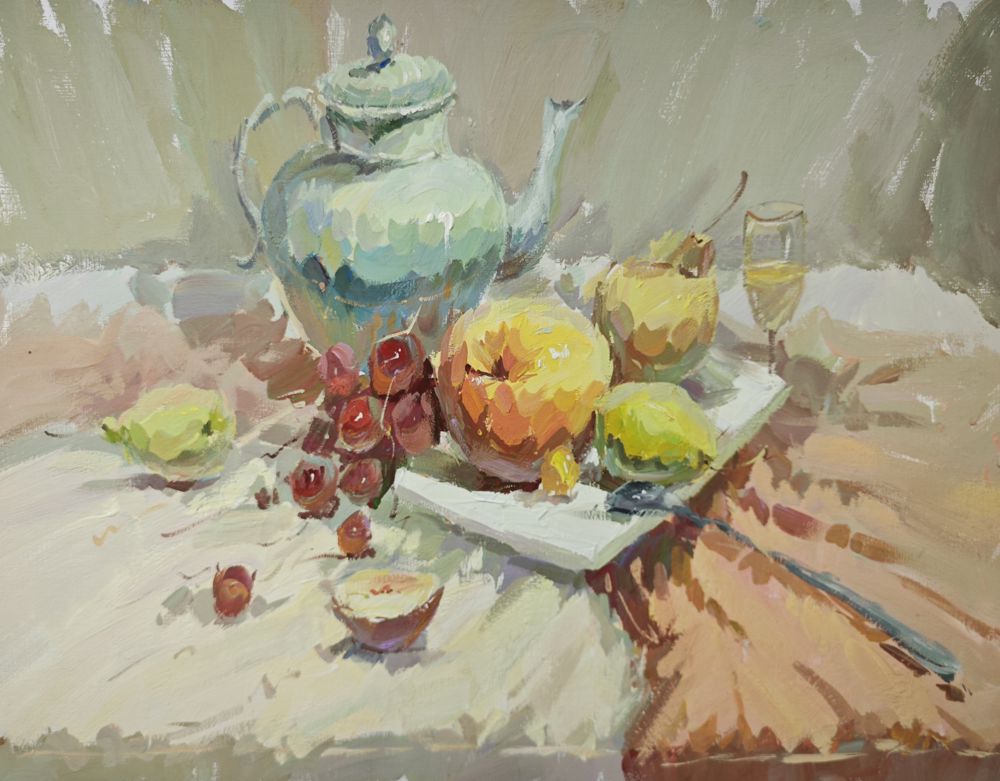 罐子、衬布与水果